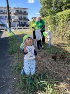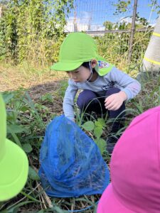 3歳児さんが虫取り網と虫籠を手に、秋の虫探しへ出かけました。