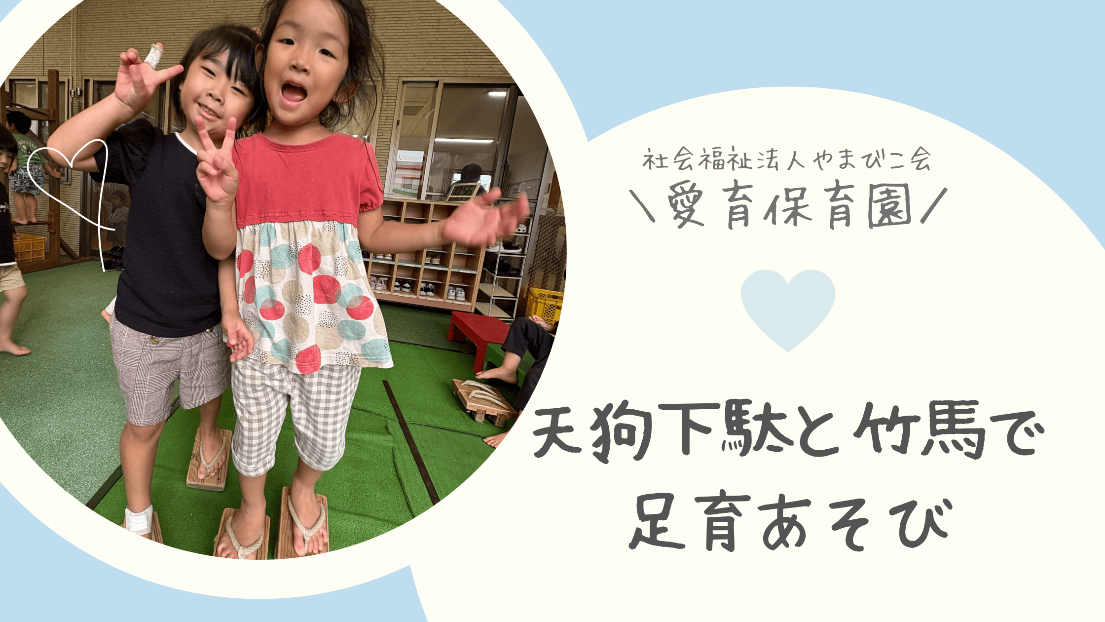 愛育保育園では、天狗下駄や竹馬を通して、からだとこころを一緒に育てる保育を大切にしています。